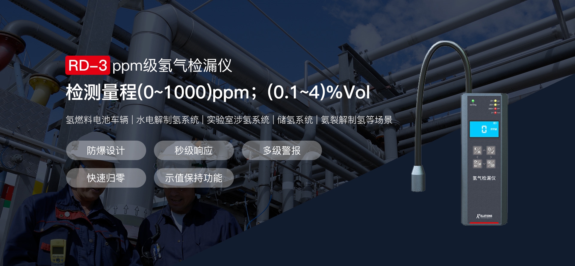 電解水、天然氣、氫分裂制氫,輸氫管道、氫氣置換,制氫站、加氫機、卸氣柱、撬裝站、氫燃料電池汽車及系統(tǒng)測試臺架、熱電聯(lián)供、氫滲氫實驗室、涉氫生產(chǎn)廠房、氫氣氣瓶間等場合中的氫氣濃度、純度、濕度檢測。
